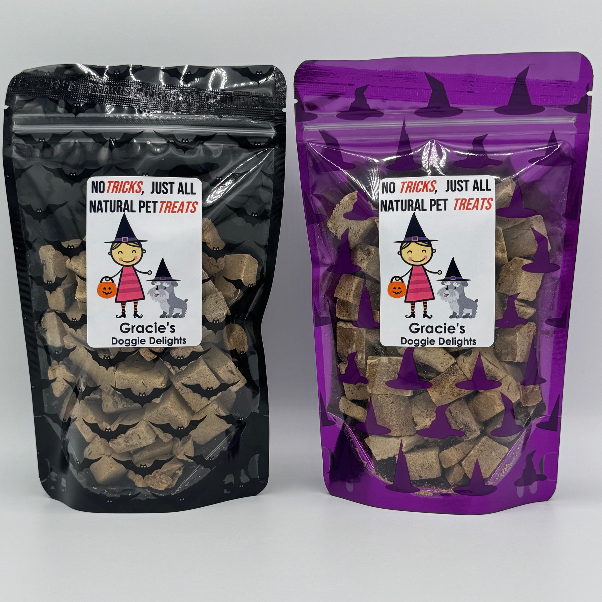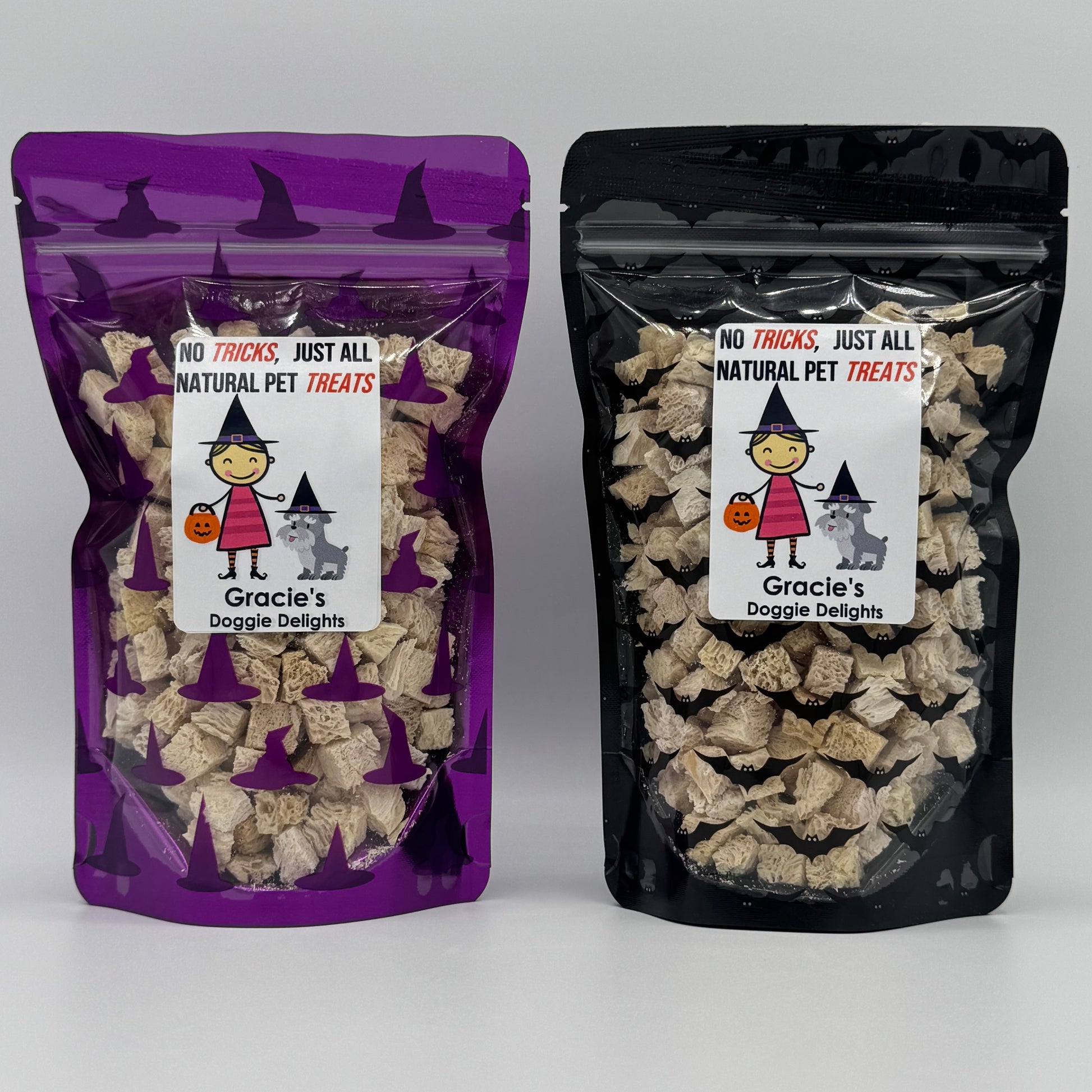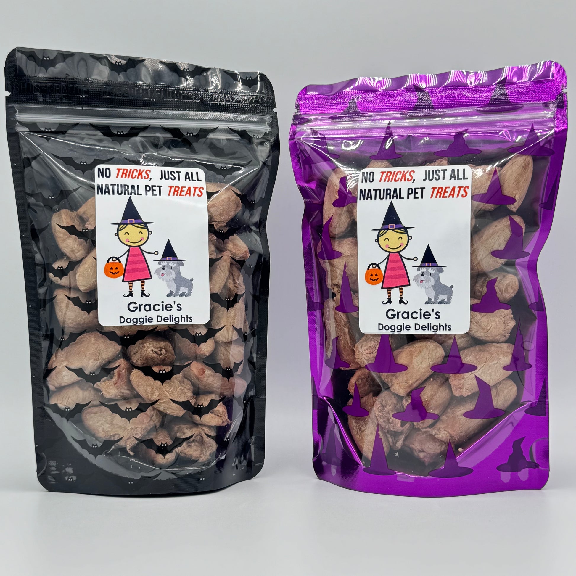 Treat the dogs in your life to something extra special this Halloween! Pick from three of our most popular treats, Chicken Heart Delights, Beef Liver Delights and Chicken Breast Delights. Each packaged in fun Halloween-themed bags decorated with bats and witch hats.